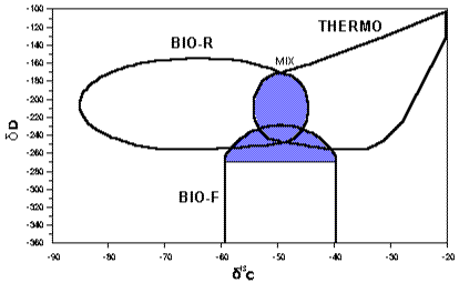 Fig. 1 Areas showing characteristic d 13C and dD values for methane generated by biological CO 2 reduction (BIO-R), biological fermentation (BIO-F), and thermogenic processes (THERMO). Shaded areas (MIX) represent methane that can be formed by any processes.