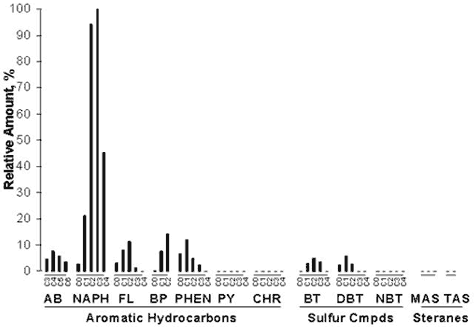 For the PAH fraction, the naphthalenes and phenanthrenes are significantly reduced and the benzo-, dibenzo- and napthobenzo- thiophenes are reduced to values barely above detection limits. The hydrocarbons which desplay a significant increase in relative concentration, are the mono- and triaromatic steranes. In this example, the triaromatic steranes became the dominant PAH in the residual Bunker C component of the soil.