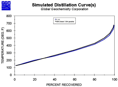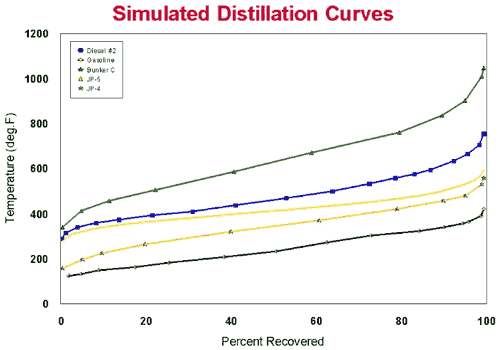 Simulated distillation (ASTM, 1994, method D2887) is a gas chromatography technique routinely employed in the petrochemical industry for determining the boiling point range of petroleum products. When applied to environmental NAPL samples, this fast and inexpensive method often provides useful information regarding the fuel-type present, because the boiling point range is a major controlling parameter in the manufacture of petroleum products. An example of boiling point distribution for selected reference fuels is shown below in Figure 13.