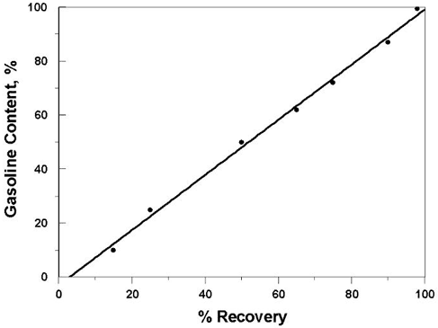 Next, by plotting amount of gasoline (%) for each mixture versus corresponding recovery (%) at the optimal for this particular fuel combination temperature of 180°C (at this temperature, all the mixtures exhibit a measurable recovery) we obtained a linear calibration curve (Figure 17).